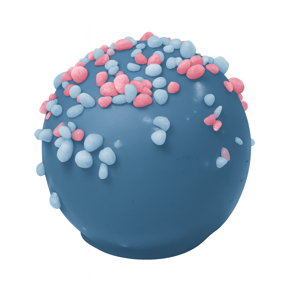 En festlig og farverig nytårstrøffel skabt til børn! Den er fyldt med blå bubblegumfyld, overtrukket med blå chokolade og pyntet med glimmer og kugler, som gør den ekstra magisk til årets sidste aften. Perfekt som en sød lille overraskelse til nytårsfejringen.